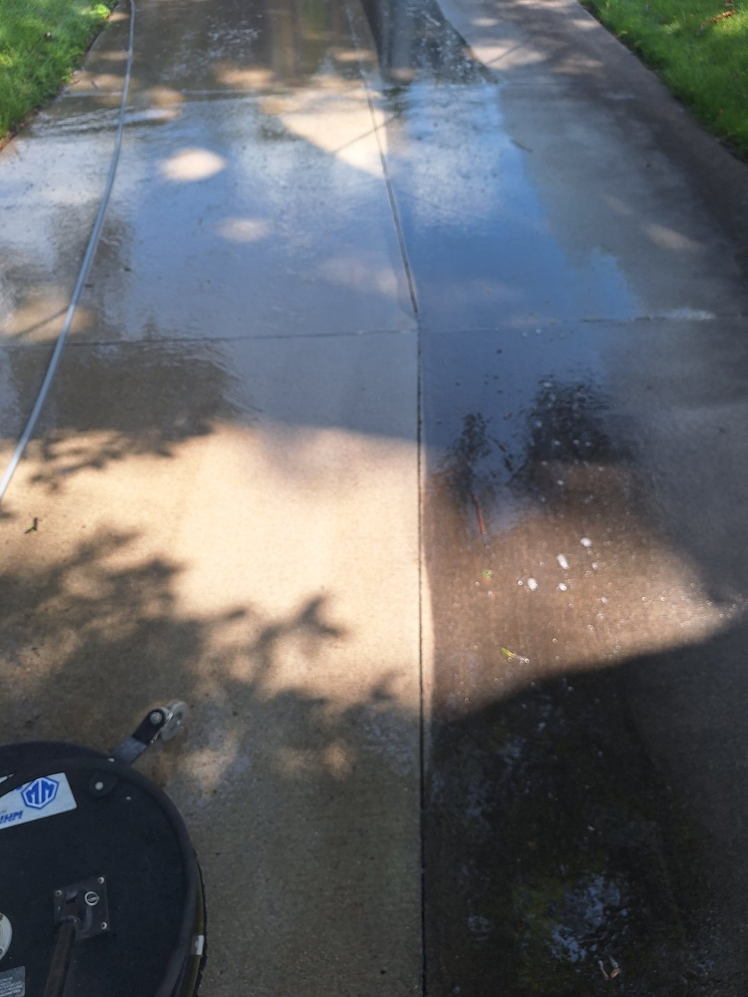 - Winter salt haze and tracked dirt rinse away, revealing the driveway's natural shade.